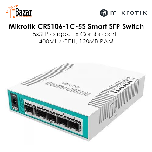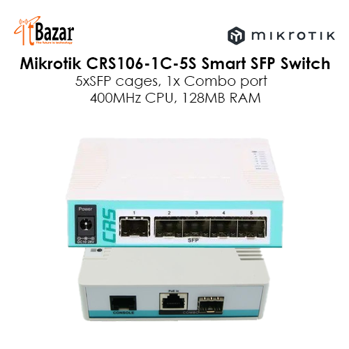 The Cloud Router Switch 106-1C-5S is a desktop size smart switch, equipped with one Gigabit Ethernet / SFP combo port and five 1.25Gbps SFP cages. The package includes a power supply. Powered by a 400MHz CPU and 128MB RAM, it runs RouterOS with a L5 license and supports 11- 30V power.