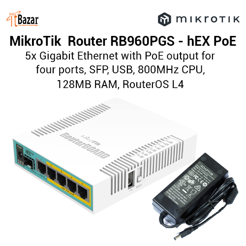 5x Gigabit Ethernet with PoE output for four ports, SFP, USB, 800MHz CPU, 128MB RAM, RouterOS L4