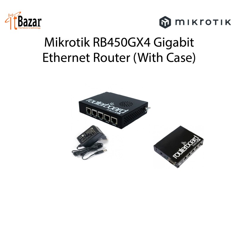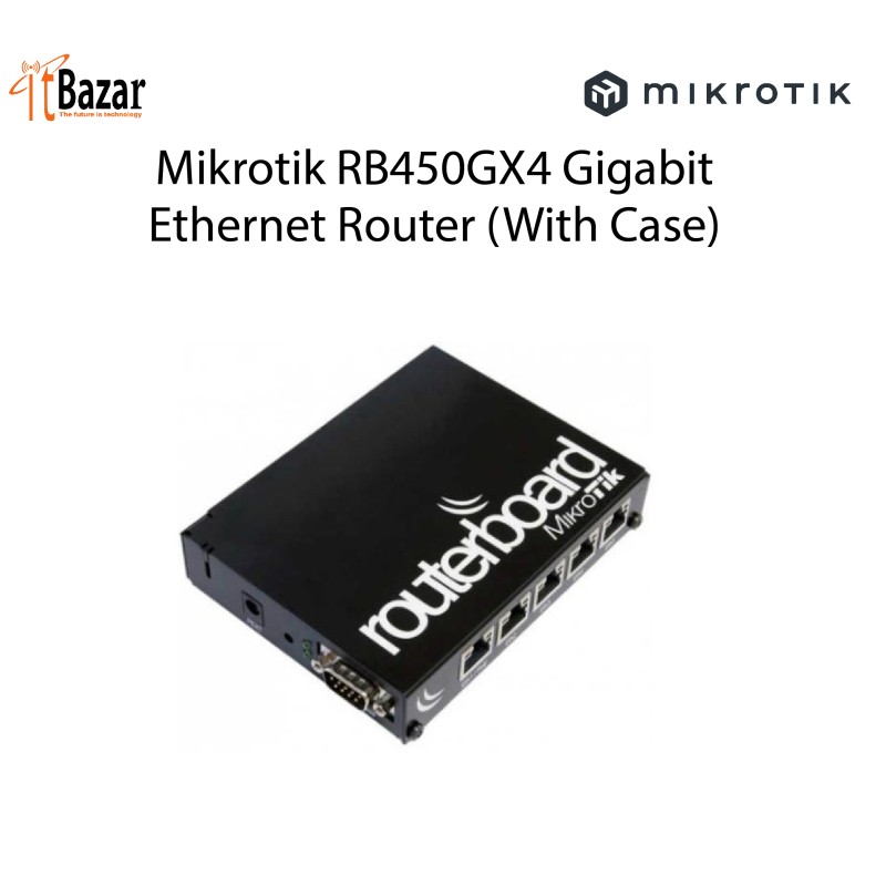 The RB450Gx4 is an Ethernet router with five Gigabit Ethernet ports, a serial port, 512 MB NAND memory and a microSD card slot