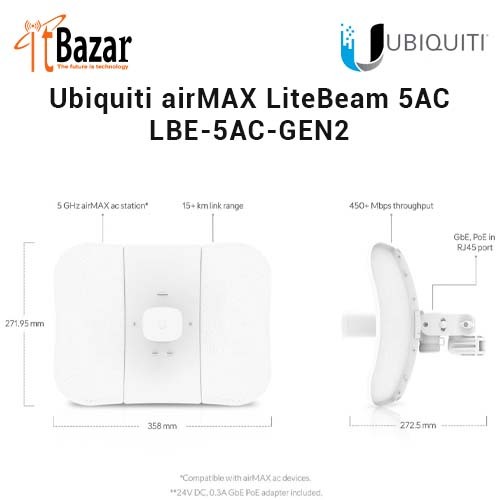 Overview Ubiquiti Networks launches the latest generation of airMAX® CPE (Customer Premises Equipment), the LiteBeam® 5AC Gen 2, with dedicated Wi-Fi management. Improved Noise Immunity The LiteBeam 5AC Gen 2 directs RF energy in a tighter beamwidth. With the focus in one direction, the LiteBeam 5AC Gen 2 blocks or spatially filters out noise, so noise immunity is improved. This feature is especially important in an area crowded with other RF signals of the same or similar frequency. Innovative Design Ubiquiti’s InnerFeed® technology integrates the radio into the feedhorn of an antenna, so there is no need for a cable. This improves performance because it eliminates cable losses. Featuring high performance and innovative mechanical design, the LiteBeam 5AC Gen 2 is versatile and cost-effective to deploy.
