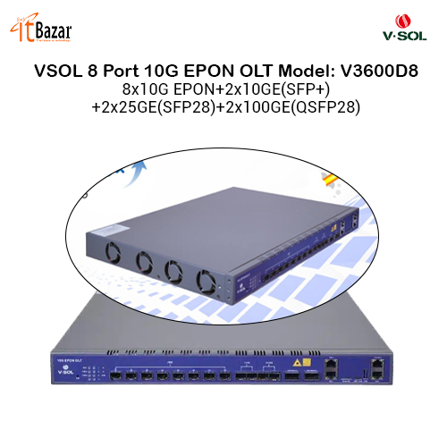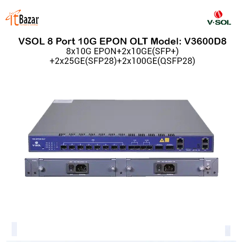 V-SOL V3600D8 is a 8-Port 10G EPON OLT which is standardized in IEEE 802.3av and is evolved from the EPONstandardIEEE802.3ah. V3600D8 has good compatibility so that 10G EPON ONUs can coexist with EPON ONUs in an ODN.t is appropriatetobedeployed in compact room environment. The OLT's can be used for FTTx networks, 5G wireless networks and other networkenvironments. V3600D8 provides 2*GE(RJ45), 2*10GE(SFP+), 2*25GE(SFP28) and 2*100GE(QSFP28) slots independent interfacefor uplink, and8*10G EPON ports for downlink(Maximum Split Ratio is 1:256)