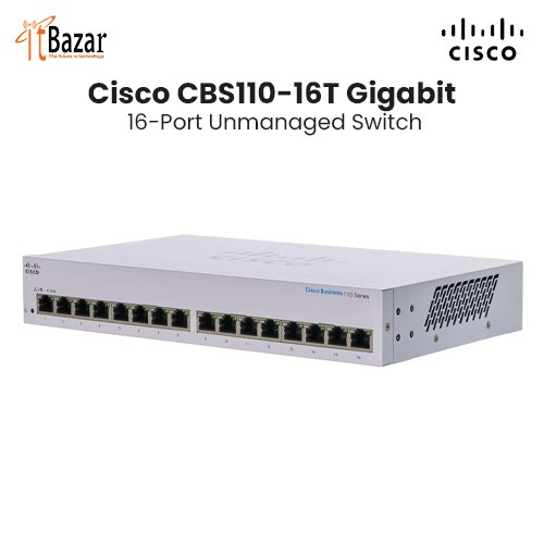 The Cisco Business CBS110-16T is an unmanaged switch designed to provide basic network connectivity for small businesses, home offices, or branch locations. The switch offers 16 Ethernet ports, specifically 10/100/1000BASE-T ports. These ports support Gigabit Ethernet speeds, enabling high-speed data transfer and reliable connectivity for devices on the network. The CBS110-16T operates as an unmanaged switch, requiring no complex configuration. It is a plug-and-play device, allowing for easy installation and use without the need for advanced network knowledge. The switch supports auto-negotiation on all ports. This feature allows the switch to automatically determine and set the optimal speed (10/100/1000 Mbps) and duplex mode (half or full duplex) for each connected device. The switch supports Auto MDI/MDIX on all ports. This feature enables the switch to automatically detect and adjust for the type of Ethernet cable being used, whether it's a straight-through or crossover cable. The CBS110-16T incorporates energy-saving features to minimize power consumption. It adjusts power usage based on network activity and link status, helping to reduce operating costs and environmental impact. Designed with a compact desktop form factor, the switch is ideal for environments with limited space. It can be placed on a desk or easily mounted on a wall, providing flexibility in deployment. The CBS110-16T complies with various IEEE networking standards, including IEEE 802.3, IEEE 802.3u, and IEEE 802.3ab. This ensures compatibility with a wide range of network devices and interoperability within the network infrastructure. The switch is equipped with LED indicators on each port, providing visual feedback on the link status and activity of each individual port. This allows for quick monitoring and troubleshooting of network connections.