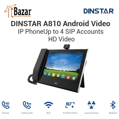 The A810 is an Android SIP video phone that boasts a 10.1-inch IPS multi-touch screen. It features an adjustable display angle ranging from 10 to 70 degrees. Equipped with a 5-megapixel camera, the A810 supports HD display with 1280x800 pixel resolution. Operating on Android 7.1, the device offers a user-friendly experience with built-in features like calendar, clock, gallery, web browser, and search. Connectivity options include Ethernet and WiFi, with a built-in WiFi hotspot feature. It supports the 2.4G IEEE801.2 b/g/n WiFi standard.