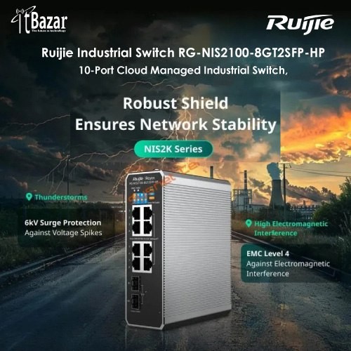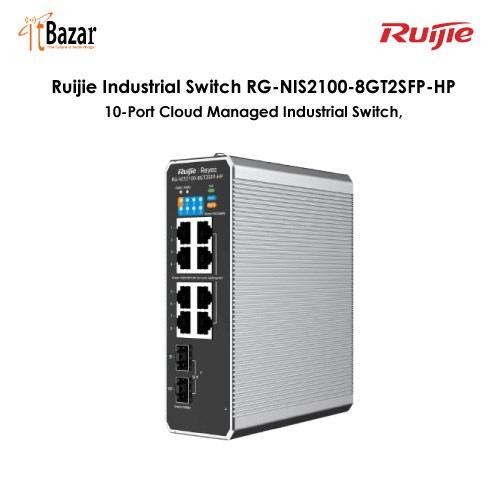 Ruijie Industrial Switch RG-NIS2100-8GT2SFP-HP, 10-Port Cloud Managed Industrial Switch, with 1 x PoE++ Port, 7 x PoE+ Ports, and 2 x SFP Uplink Ports রুইজি ইন্ডাস্ট্রিয়াল সুইচ