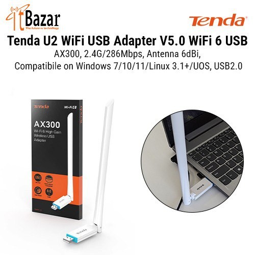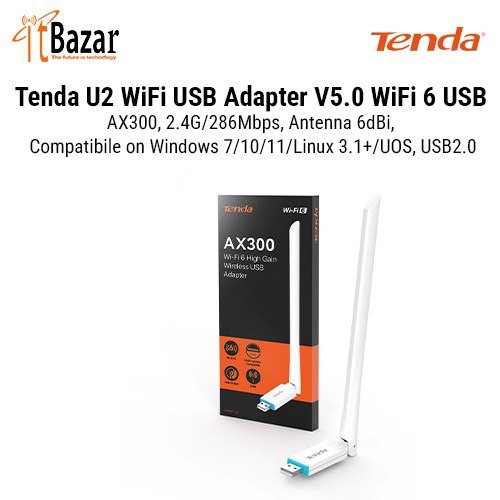 Tenda U2 WiFi USB Adapter V5.0 WiFi 6 USB AX300, 2.4G/286Mbps, Antenna 6dBi, Compatibile on Windows 7/10/11/Linux 3.1+/UOS, USB2.0