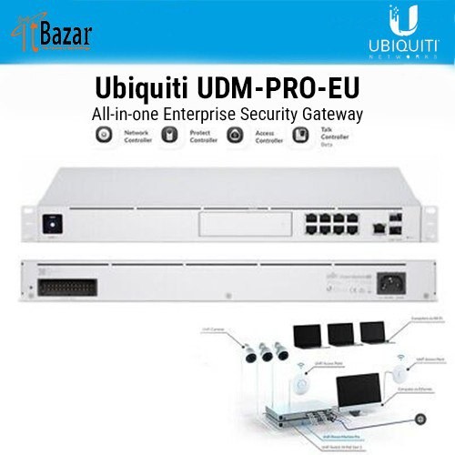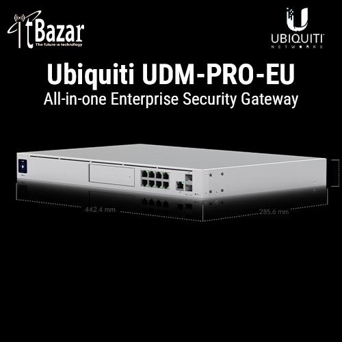The Ubiquiti UDM-PRO-EU Dream Machine Professional UniFi Gateway Console is a high-performance network management solution designed for businesses and advanced home networks. Powered by a 1.7 GHz quad-core ARM Cortex-A57 processor and 4 GB DDR4 memory, it handles demanding tasks and multiple applications with ease, complemented by 16 GB eMMC storage for configuration and data. A 1.3-inch touchscreen provides at-a-glance network status and configuration options, with a factory reset button for quick recovery. The UDM-PRO-EU features versatile connectivity with eight LAN GbE RJ45 ports, one WAN GbE RJ45 port, and two SFP+ ports supporting 10G fiber for long-distance, high-speed transmission. It includes an Ethernet management interface and Bluetooth for remote administration. Robust security features include a 3.5 Gbps IDS/IPS throughput to detect and mitigate threats, alongside support for advanced protocols such as WPA3, VLAN, VPN, and firewall protections. With its powerful performance, comprehensive connectivity, and built-in security, the UDM-PRO-EU is ideal for reliable and secure network management in professional and enterprise environments.