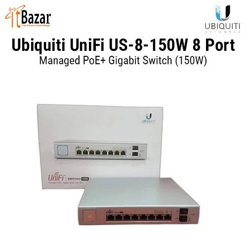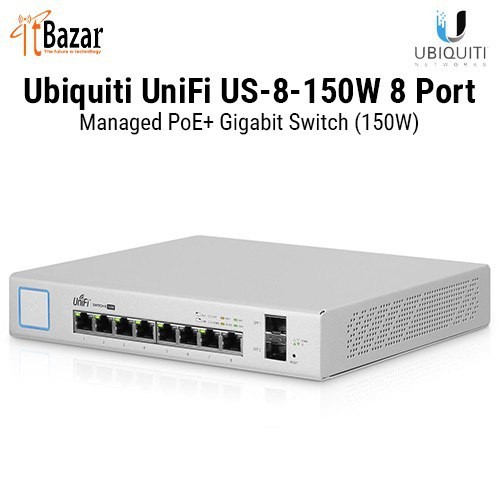 The Ubiquiti UniFi US-8-150W is a fully managed 8 port PoE+ Gigabit switch, delivering robust performance and intelligent switching for growing networks. The US-8-150W is a fanless UniFi switch which delivers a quiet yet powerful performance.