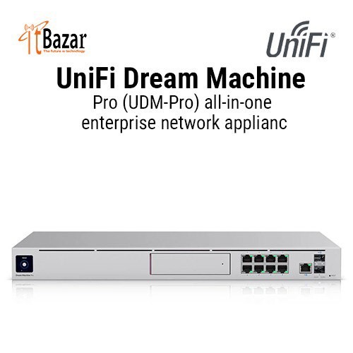 The UDM Pro is an all-in-one networking console that runs every UniFi OS application, like Network and Protect. It features a built-in security gateway, 10G SFP+ WAN support, an 8-port Gigabit switch, and network video recorder that supports compatible 3.5" hard disk drives (HDDs).