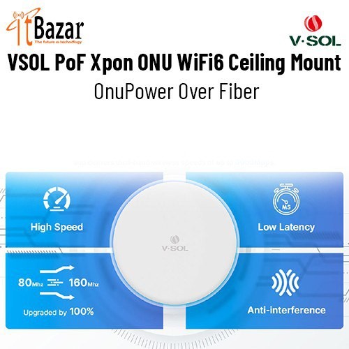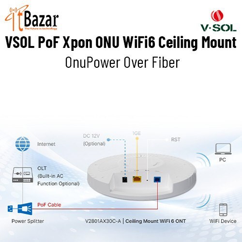 VSOL V2801AX30C-A is a newly launched circular ceiling-mounted WiFi 6 ONT, which is small, beautiful and easy to install. It supportsPoFoptical-electric composite cable power supply, PoF into the room, power failure without disconnection, power transmission andoptical fibertransmission do not interfere with each other, more stable and safe. This ONT is flexible and easy to use in a variety of scenariossuchashotel lobbies, classrooms, conference rooms, restaurants, etc. It is equipped with high performance AX3000 chipset, built-inWiFi antenna,wireless rate up to 3000Mbps, providing users with excellent performance