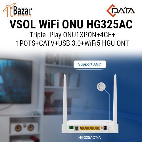 HG325ACT-A (4GE+1POTS+CATV+USB 3.0+WiFi 5 XPON HGU ONT) is a broadband access device specially designedtomeettheneeds of fixed network operators for FTTH and triple play services. The ONT is based on high-performance chip solutions, supports XPON dual-mode technology (EPON and GPON), andalsosupportsIEEE802.11b/g/n/ac WiFi 5 technology and other Layer 2/Layer 3 functions, providing data service for carrier-grade FTTHapplications.While maintaining performance, the antenna has been revolutionised into a dual-band integrated antenna, which not only simplifiesthedesign, but also reduces hardware costs and saves valuable physical space.In addition, the ONT also supports the OAM/OMCI protocol,and we can configure or manage various services of the ONT on the VSOL OLT. The ONT has high reliability, is easy to manage and maintain, and has QoS guarantees for various services. It conforms toaseriesofinternational technical standards such as IEEE802.3ah and ITU-T G.984.